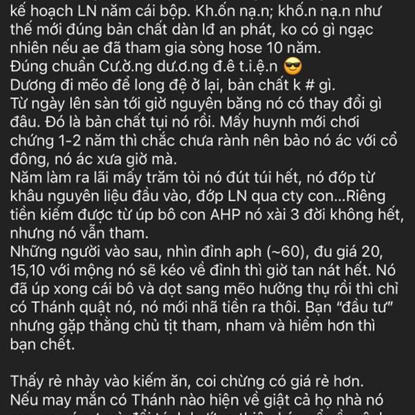 Năm nay anh em nào đi dự ĐH nếu có gặp ông bác năm ngoái (gồng lỗ AAA) xong bị thằng C.ường hay thằng gì bên ban giám đốc bảo cổ 3x thì bận tâm gì cổ tức ấy thì chuyển cho bác ấy bọc mắm tôm 😎
