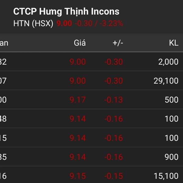 bao giờ thì mới chấm dứt tình trạng nhỏ lẻ bán tháo HTN vậy? Nó đạp từ 14 xuống vùng 9, theo lý thuyết vùng này sẽ chán nản ko ai muốn bán nữa. Thế mà hôm nay các bạn vẫn lôi ra bán