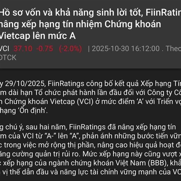 Bơm tiếp oxi cho anh em, VCI được nâng tín nhiệm lên A từ A- và cao hơn rất nhiều so với BBB của ngành chứng VNindex