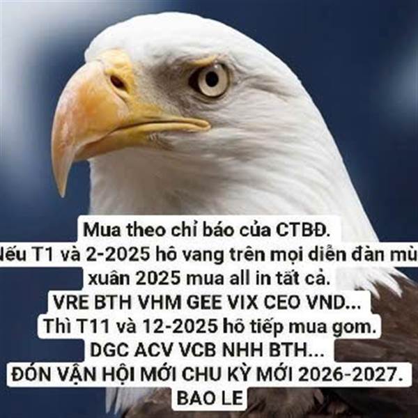 Mua theo chỉ báo của CTBĐ. Nếu T1 và 2-2025 hô vang trên mọi diễn đàn mùa xuân 2025 mua all in tất cả.VRE BTH VHM GEE VIX CEO VND... Thì T11 và 12-2025 hô tiếp mua gom. DGC ACV VCB NHH BTH... VẬN HỘI ...Thêm