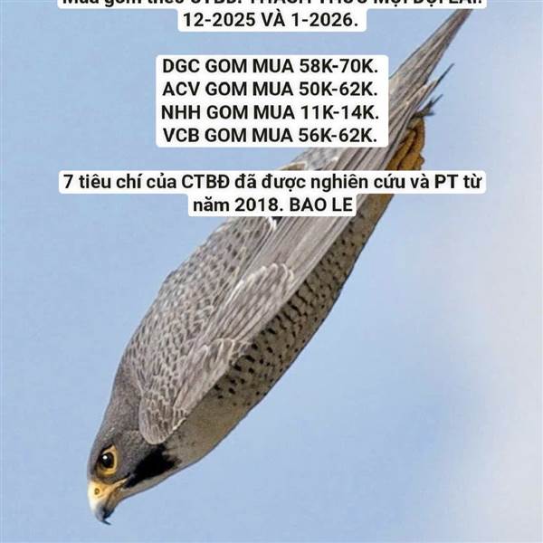 Mua gom theo CTBĐ. THÁCH THỨC MỌI ĐỘI LÁI. 12-2025 VÀ 1-2026. DGC GOM MUA 58K-70K. ACV GOM MUA 50K-62K. NHH GOM MUA 11K-14K. VCB GOM MUA 56K-62K. 7 tiêu chí của CTBĐ đã được PT từ năm 2018.
