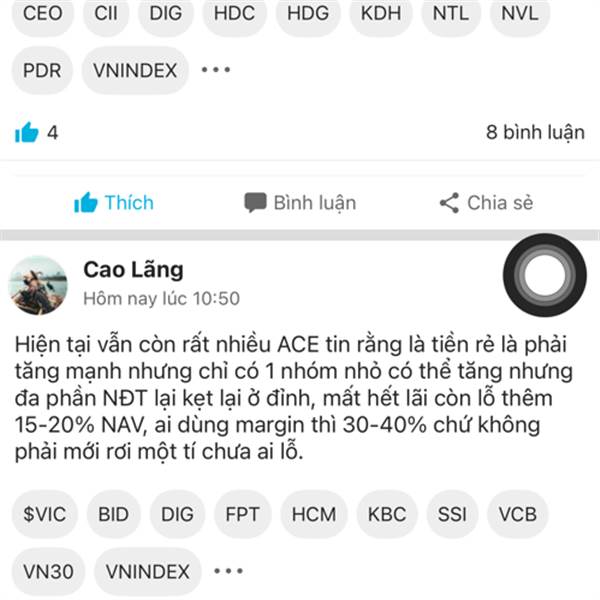 Hiện tại vẫn còn rất nhiều ACE tin rằng là tiền rẻ là phải tăng mạnh nhưng chỉ có 1 nhóm nhỏ có thể tăng nhưng đa phần NĐT lại kẹt lại ở đỉnh, mất hết lãi còn lỗ thêm 15-20% NAV, ai dùng margin thì 30...Thêm