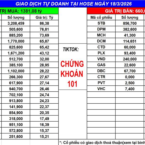 Ngày 18/3/2025 tự doanh MUA ròng: 721 tỷ (bao gồm khớp lệnh và thỏa thuận)