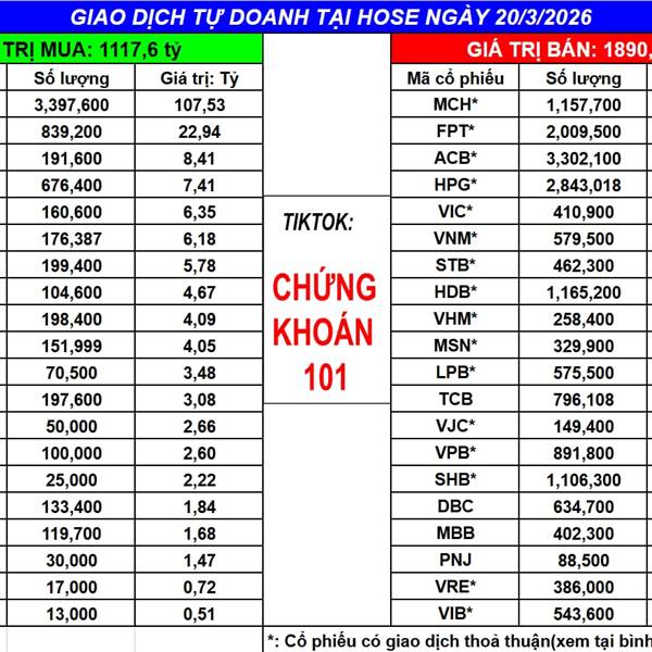 Ngày 20/3/2025 tự doanh BÁN ròng: -773.04 tỷ (bao gồm khớp lệnh và thỏa thuận)