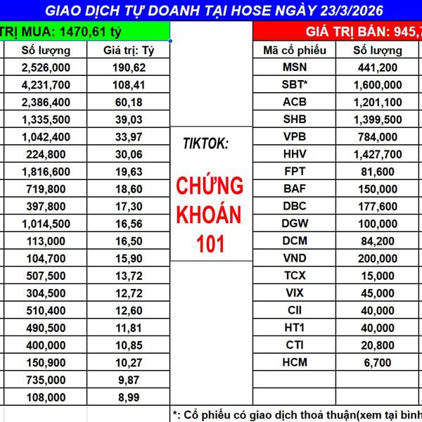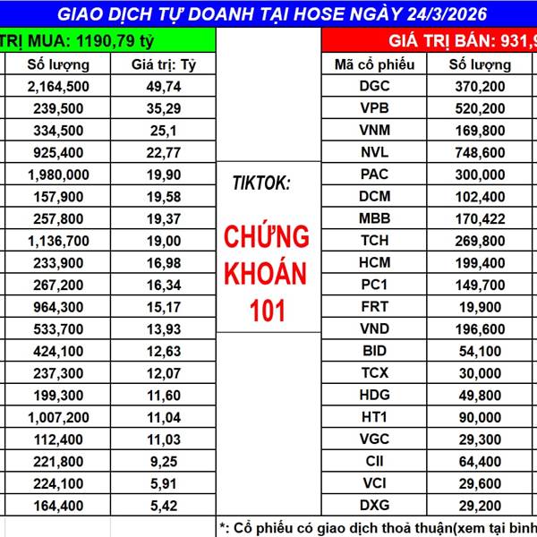 Ngày 24/3/2025 tự doanh MUA ròng: 258.87 tỷ (bao gồm khớp lệnh và thỏa thuận)