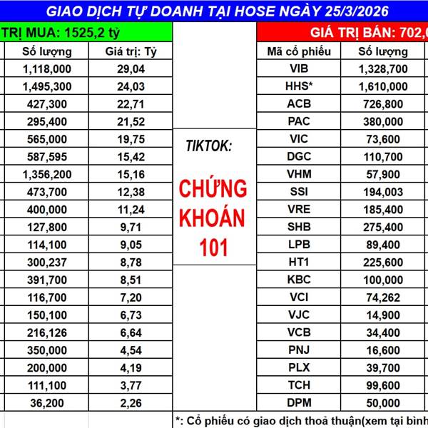Ngày 26/3/2025 tự doanh MUA ròng: -617.87 tỷ (bao gồm khớp lệnh và thỏa thuận)