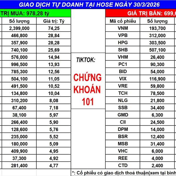 Ngày 30/3/2025 tự doanh MUA ròng: 278.64 tỷ (bao gồm khớp lệnh và thỏa thuận)
