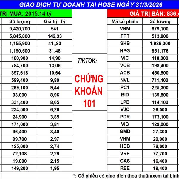 Ngày 31/3/2025 tự doanh MUA ròng: 1178.73 tỷ (bao gồm khớp lệnh và thỏa thuận)