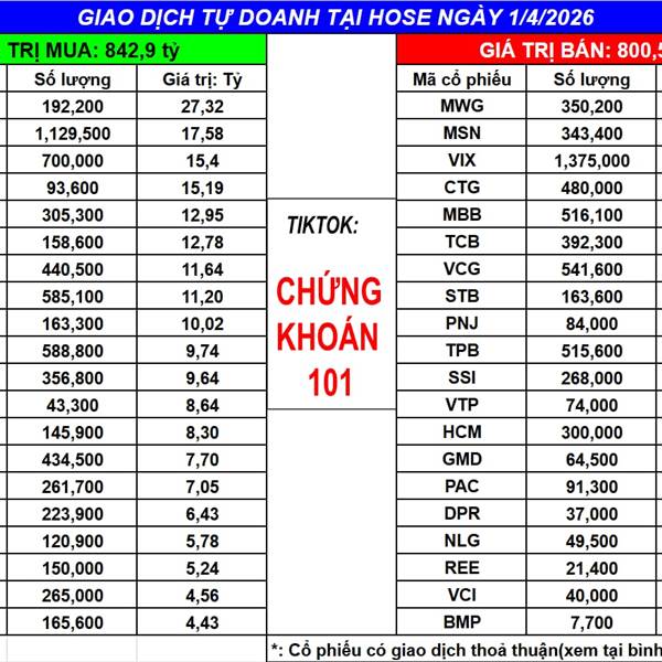 Ngày 1/4/2025 tự doanh MUA ròng: 42.35 tỷ (bao gồm khớp lệnh và thỏa thuận)