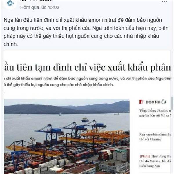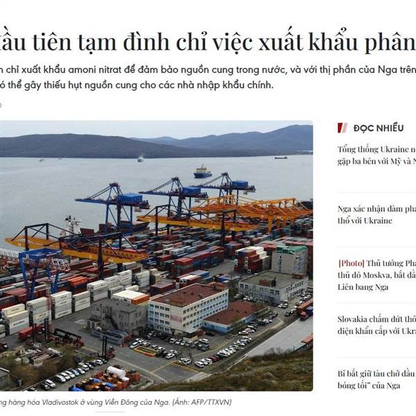 Nga lần đầu tiên giảm xuất khẩu phân bón Chính quyền Nga đã đình chỉ các chuyến hàng amoni nitrat ra nước ngoài để đảm bảo nguồn cung trong nước. Nga sản xuất khoảng 25% lượng amoni nitrat của thế giới ...Thêm