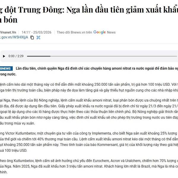- Việc Nga tạm dừng xuất khẩu amoni nitrat trong mùa gieo trồng đang làm gia tăng áp lực lên thị trường phân bón toàn cầu vốn đã căng thẳng, đồng thời đẩy chi phí nông nghiệp và rủi ro giá lương thực ...Thêm
