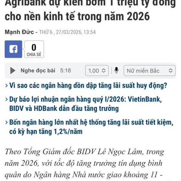 Trong năm 2026, với tốc độ tăng trưởng bình quân do Ngân hàng Nhà nước giao khoảng 11 - 12%, các ngân hàng thương mại Nhà nước dự kiến gia tăng giải ngân khoảng 1 triệu tỷ đồng, để phục vụ các nhu cầu...Thêm