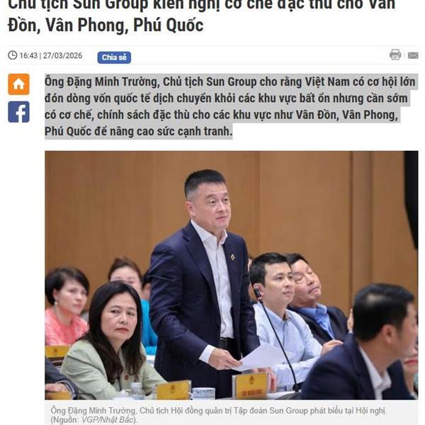 Ông Đặng Minh Trường, Chủ tịch Sun Group cho rằng Việt Nam có cơ hội lớn đón dòng vốn quốc tế dịch chuyển khỏi các khu vực bất ổn nhưng cần sớm có cơ chế, chính sách đặc thù cho các khu vực như Vân Đồ...Thêm