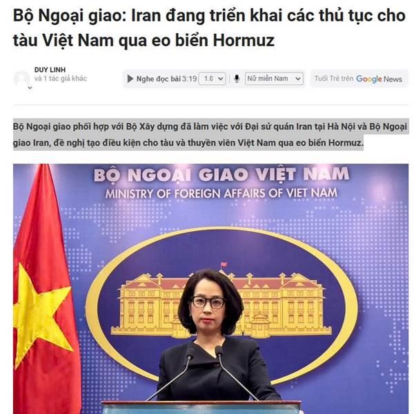 Bộ Ngoại gi ao phối hợp với Bộ Xây dựng đã làm việc với Đại sứ quán Iran tại Hà Nội và Bộ Ngoại giao Iran, đề nghị tạo điều kiện cho tàu và thuyền viên Việt Nam qua eo biển Hormuz.