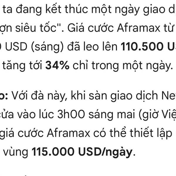 Đúng như dự đoán giá cước vận tải dầu khí tăng mạnh 2 hôm nay, hôm qua tăng 20%, nay tiêp tục tục tăng 21% kịch bản đúng như dự đoan các quốc gia tăng cường tích trữ dầu,khí vì bât ổn chính trị và an...Thêm