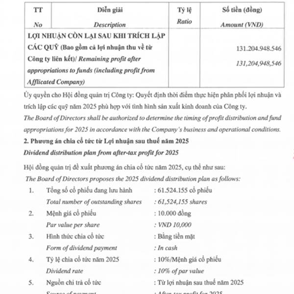 Dự kiến cổ tức bằng tiền 10%. Một doanh nghiệp làm dự án bđs nhưng không tăng vốn bằng hình thức phát hành cổ phiếu huy động vốn để làm bđs, chia cổ tức bằng tiền, thế mấy thấy là doanh nghiệp tốt