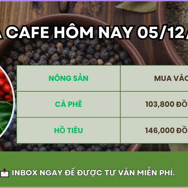 Khảo sát HÔM NAY ngày 5/12, giá cà phê tại khu vực Tây Nguyên dao động trong khoảng 103.000 – 103.800 đồng/kg, không thay đổi nhiều so v...Thêm