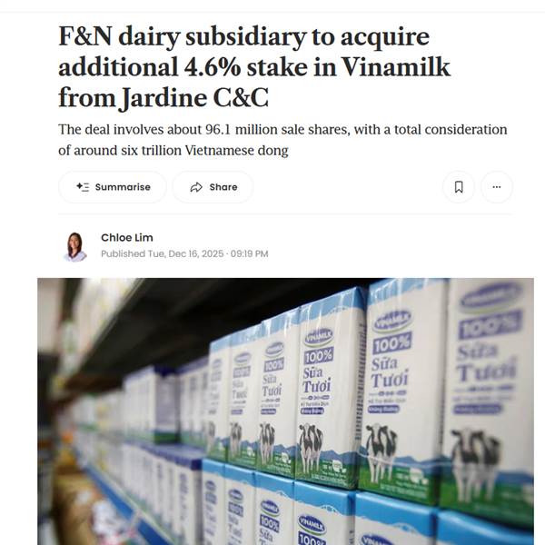 F&N thông qua công ty con mua thêm 4,6% cổ phần tại Vinamilk từ Jardine C&C