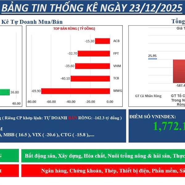 Tự Doanh ngày 23/12/2025 - Tự Doanh BÁN RÒNG : -108.1 tỷ đồng Riêng CP khớp lệnh : TỰ DOANH BÁN RÒNG : -162.3 tỷ đồng + Top MUA ròng : SSI, VPB, VPL + Top BÁN ròng : MWG, TCB, VHM