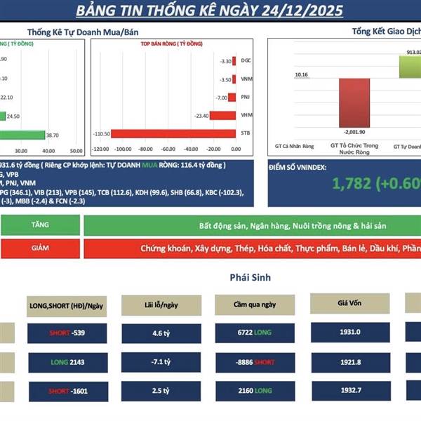 Tự Doanh ngày 24/12/2025 - Tự Doanh MUA RÒNG : 931.6 tỷ đồng Riêng CP khớp lệnh : TỰ DOANH MUA RÒNG : 116.4 tỷ đồng + Top MUA ròng : TCB, HPG, VPB + Top BÁN ròng : STB, VHM, PNJ